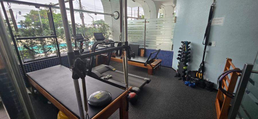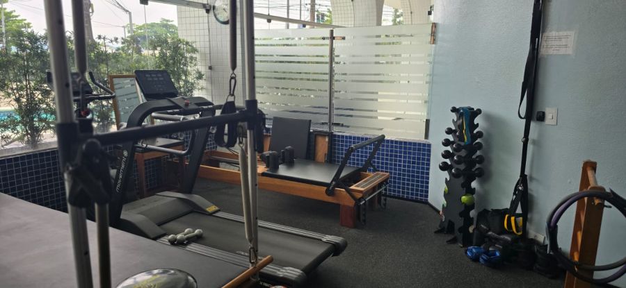 O edifício oferece uma estrutura completa de lazer e segurança, incluindo piscina, sala de ginástica com aparelhos de pilates, salão de festas, jardim e bicicletário. O acesso é controlado por portaria 24 horas e o deslocamento vertical é atendido por elevadores. O condomínio é pet-friendly, permitindo a permanência de animais de estimação.